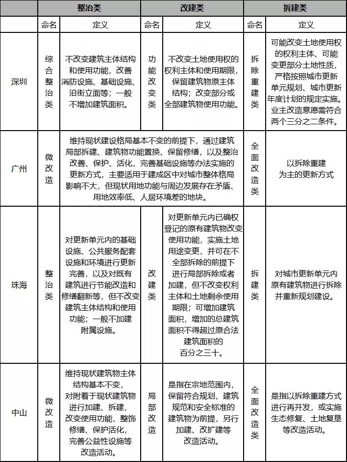 按照改造力度由弱到強,城市更新項目可分為整治類、改建類和拆建類三種類型。不同城市命名略有不同,但實質(zhì)相近,例如深圳將城市更新項目分為綜合整治類、功能改變類和拆除重建類(分別對應(yīng)整治、改建和拆建);廣州分為全面改造(對應(yīng)拆建)和微改造(對應(yīng)整治和改建);中山分為微改造、局部改造和全面改造(分別對應(yīng)整治、改建和拆建)。