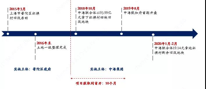 2018年10月,上海海升環(huán)盛房地產(chǎn)開發(fā)有限公司(以下簡稱聯(lián)合體)以93.99億元地價摘得紅旗村四塊地,該公司由中海地產(chǎn)、上海中環(huán)投資開發(fā)(集團)有限公司、上海新長征(集團)有限公司聯(lián)合成立(實控人為普陀區(qū)長征鎮(zhèn)農(nóng)村集體資產(chǎn)管理委員會),持股比例分別為70%、20%、10%;2020年1月-2月,聯(lián)合體再以19.14億元拿下紅旗村剩余舊改地塊。出讓地塊要求競得人配建租賃房、保障房、廣場、公共設(shè)施、社區(qū)配套設(shè)施等,同時商辦項目要求全部自持,且需引入企業(yè)總部、研發(fā)中心、科技創(chuàng)新、現(xiàn)代商貿(mào)等符合普陀區(qū)產(chǎn)業(yè)定位的企業(yè)。2019年8月,中海甄如府首期開盤,項目從拿地到首開僅10個月。