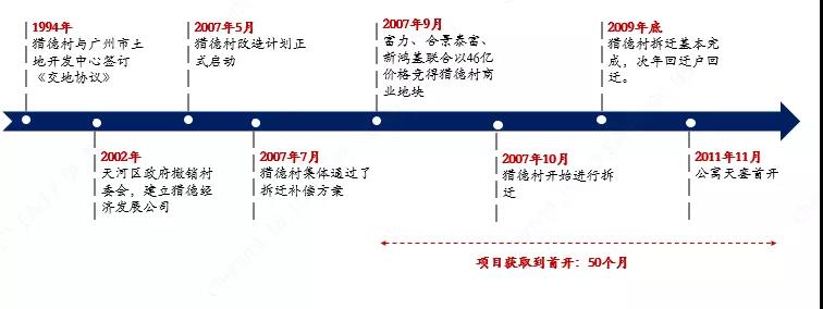 2007年9月,富力、合景泰富、新鴻基聯(lián)合以46億的價格競得獵德村西片區(qū)商業(yè)地塊,其中約25億用作拆遷款安置及新樓建設(shè)款,10億用于投資村南酒店。2007年10月獵德村開始進(jìn)行拆遷,2009年底拆遷基本完成,2010年初回遷戶回遷至原村東片區(qū)。