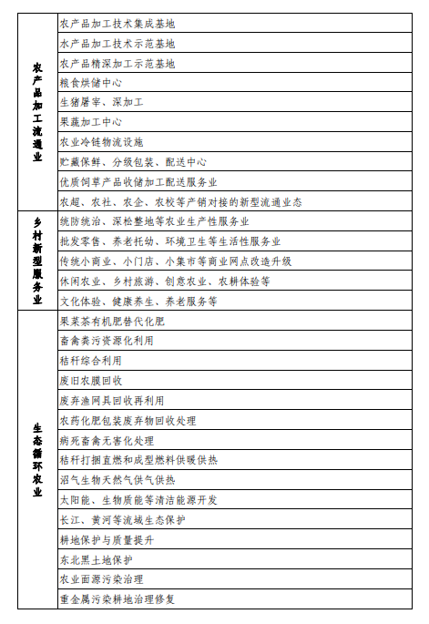 (四)農(nóng)產(chǎn)品加工流通業(yè)。鼓勵(lì)社會(huì)資本參與糧食主產(chǎn)區(qū)和特色農(nóng)產(chǎn)品優(yōu)勢(shì)區(qū)發(fā)展農(nóng)產(chǎn)品加工業(yè),提升行業(yè)機(jī)械化、標(biāo)準(zhǔn)化水平,助力建設(shè)一批農(nóng)產(chǎn)品精深加工基地和加工強(qiáng)縣。鼓勵(lì)社會(huì)資本聯(lián)合農(nóng)民合作社和家庭農(nóng)場發(fā)展農(nóng)產(chǎn)品初加工,建設(shè)一批專業(yè)村鎮(zhèn)。統(tǒng)籌農(nóng)產(chǎn)品產(chǎn)地、集散地、銷地批發(fā)市場建設(shè),加強(qiáng)農(nóng)產(chǎn)品倉儲(chǔ)保鮮冷鏈物流體系建設(shè),建設(shè)一批貯藏保鮮、分級(jí)包裝、冷鏈配送等設(shè)施設(shè)備,提高冷鏈物流服務(wù)效率和質(zhì)量,打造農(nóng)產(chǎn)品物流節(jié)點(diǎn),發(fā)展農(nóng)超、農(nóng)社、農(nóng)企、農(nóng)校等產(chǎn)銷對(duì)接的新型流通業(yè)態(tài)。支持社會(huì)資本參與現(xiàn)代農(nóng)業(yè)產(chǎn)業(yè)園、農(nóng)村產(chǎn)業(yè)融合發(fā)展示范園、農(nóng)業(yè)產(chǎn)業(yè)強(qiáng)鎮(zhèn)建設(shè)。