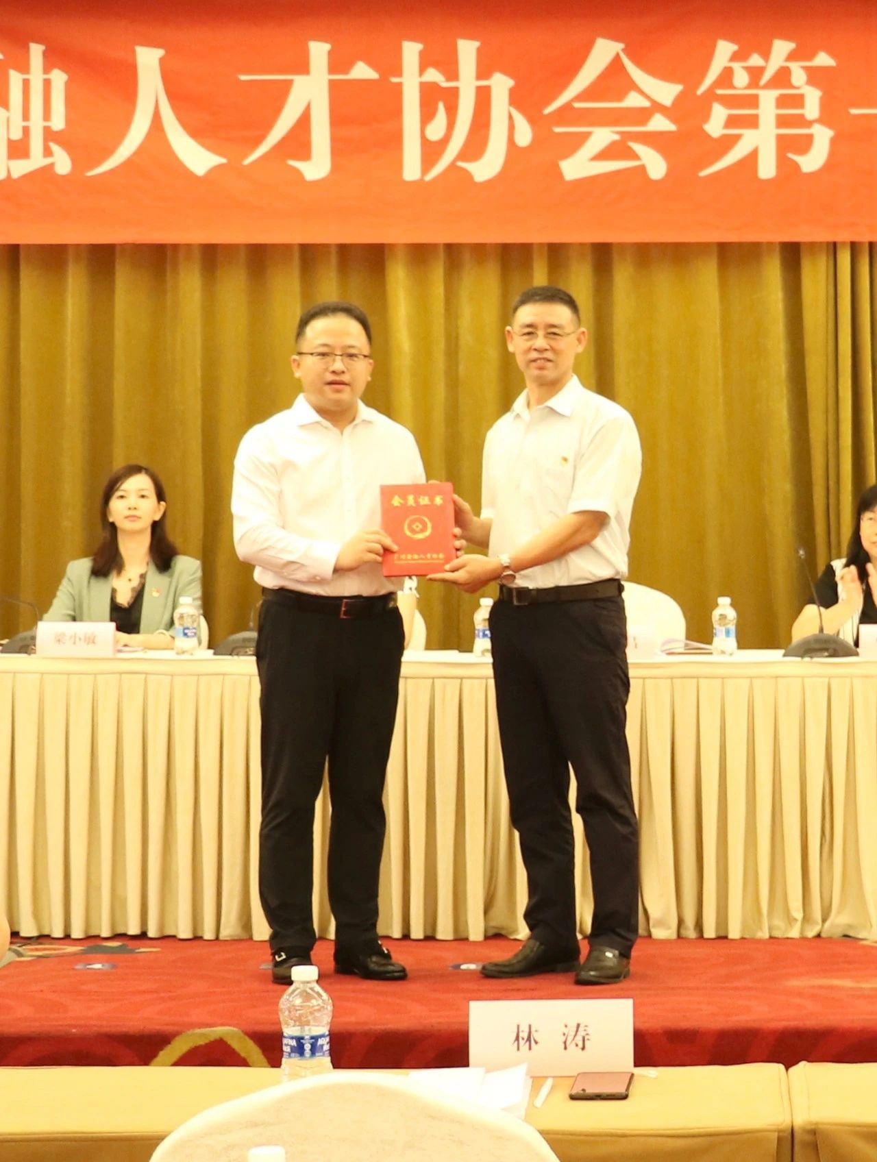 王德昌調(diào)研員為林濤董事長(zhǎng)(左)頒發(fā)聘書(shū)