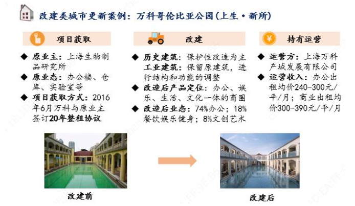 改建類項目改造力度居中、一般需由市級城市更新管理部門審批,房企一般可通過改造、持有運營的等方式參與項目。改建類項目一般不改變土地使用權(quán)的權(quán)力主體和使用期限,在不全部拆除的前提下進(jìn)行局部拆除或加建,可實施土地用途變更,部分城市可增加建筑面積(但一般會對建筑面積增幅設(shè)限,例如珠海要求不超過30%)。房企可通過改造、持有運營等方式參與項目,代表案例如萬科上海哥倫比亞公園。