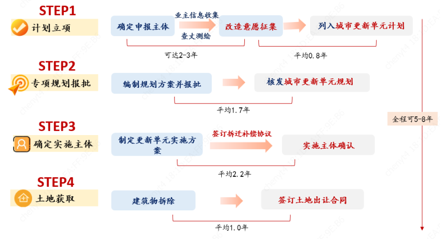 本部分重點討論房企參與較多的拆建類城市更新項目流程。拆建類城市更新項目分為四大步驟,(1)計劃立項、(2)專項規(guī)劃報批、(3)實施主體確認(rèn)和(4)土地獲取,完成四個步驟耗時可達(dá)5-8年,流程越靠前項目不確定性越高。