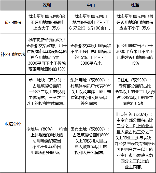 指項目申請納入“城市更新單元計劃”。申報主體可以為權(quán)利主體(如村委會等)、由權(quán)利主體委托的市場主體(如房企)、或市/區(qū)政府,項目申報需滿足一定前提,如達(dá)到最小改造規(guī)模、補公用地達(dá)到一定比重、改造意愿滿足條件等。其中,改造意愿征集是立項前的關(guān)鍵步驟,不同城市要求有所不同,如深圳為單地塊“雙2/3”,珠海為舊住宅“雙95%”,非舊住宅“雙3/4”。在完成意愿征集后,申報主體可向區(qū)更新辦提交申報材料,經(jīng)區(qū)、市兩級審批后項目納入“城市更新單元計劃”,標(biāo)志立項成功。