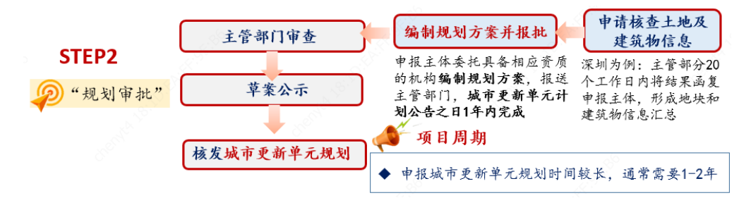 指“城市更新單元規(guī)劃”的編制和審批,通常需在立項公告后一定時限內(nèi)完成方案報送,如深圳要求1年。在這一流程中,申報主體一般首先向主管部門申請核查土地及建筑物信息,再聘請有資質(zhì)的規(guī)劃設(shè)計單位編制規(guī)劃方案,并與規(guī)劃國土部門深入溝通、報審,以獲得對公司有利的批復(fù)指標(biāo)。專項規(guī)劃報批是房企就容積率、配建要求等與政府進(jìn)行博弈的過程,通常需要耗時1-2年。