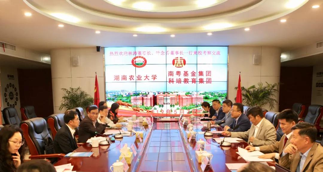 5月7日,廣州南粵基金集團(tuán)有限公司(簡(jiǎn)稱“南粵基金”)董事長(zhǎng)林濤,中國(guó)科培教育集團(tuán)董事會(huì)主席、廣東理工學(xué)院董事長(zhǎng)葉念喬一行到訪湖南農(nóng)業(yè)大學(xué),與中國(guó)工程院院士、湖南農(nóng)業(yè)大學(xué)黨委副書記、校長(zhǎng)鄒學(xué)校舉行座談,雙方就合作辦學(xué)事宜開展深入交流并達(dá)成重要共識(shí)。會(huì)談結(jié)束后,湖南農(nóng)業(yè)大學(xué)黨委書記陳弘與林濤董事長(zhǎng)一行進(jìn)行了親切交流。