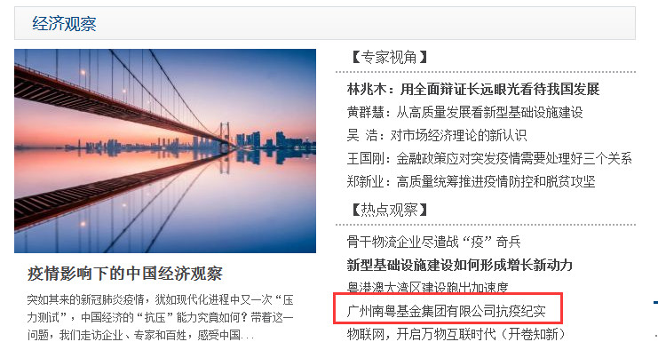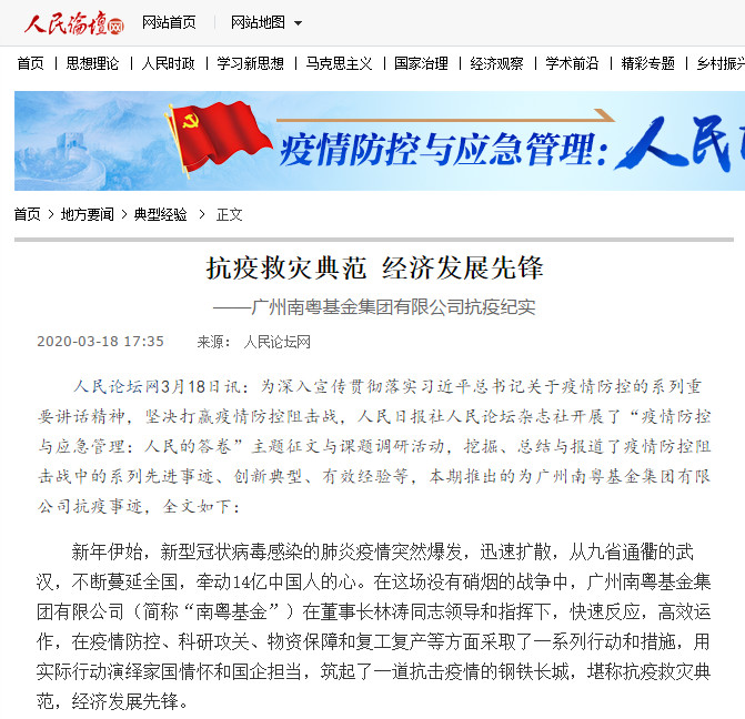 3月18日,人民日報(bào)社人民論壇雜志社開展了“疫情防控與應(yīng)急管理:人民的答卷”主題征文與課題調(diào)研活動(dòng),以《抗疫救災(zāi)典范 經(jīng)濟(jì)發(fā)展先鋒》為題,全面、系統(tǒng)地總結(jié)報(bào)道了南粵基金在疫情防控阻擊戰(zhàn)中的先進(jìn)事跡、創(chuàng)新典型和有效經(jīng)驗(yàn)。