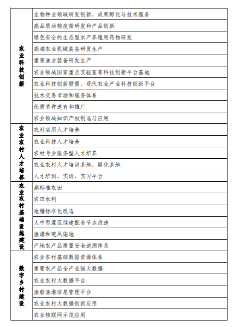 (七)農(nóng)業(yè)科技創(chuàng)新。鼓勵(lì)社會(huì)資本創(chuàng)辦農(nóng)業(yè)科技創(chuàng)新型企業(yè),參與實(shí)施農(nóng)業(yè)關(guān)鍵核心技術(shù)攻關(guān)行動(dòng),開展生物種業(yè)、重型農(nóng)機(jī)、漁業(yè)裝備、智慧農(nóng)業(yè)、綠色投入品、漁具標(biāo)識(shí)和玻璃鋼等新材料漁船等領(lǐng)域的研發(fā)創(chuàng)新、成果轉(zhuǎn)化與技術(shù)服務(wù)。鼓勵(lì)社會(huì)資本牽頭建設(shè)農(nóng)業(yè)領(lǐng)域國家重點(diǎn)實(shí)驗(yàn)室等科技創(chuàng)新平臺(tái)基地,參與農(nóng)業(yè)科技創(chuàng)新聯(lián)盟、國家現(xiàn)代農(nóng)業(yè)產(chǎn)業(yè)科技創(chuàng)新中心等建設(shè),打造產(chǎn)學(xué)研用深度融合平臺(tái)。引導(dǎo)社會(huì)資本發(fā)展技術(shù)交易市場和服務(wù)機(jī)構(gòu),提供科技成果轉(zhuǎn)化服務(wù),加快先進(jìn)實(shí)用技術(shù)集成創(chuàng)新與推廣應(yīng)用。