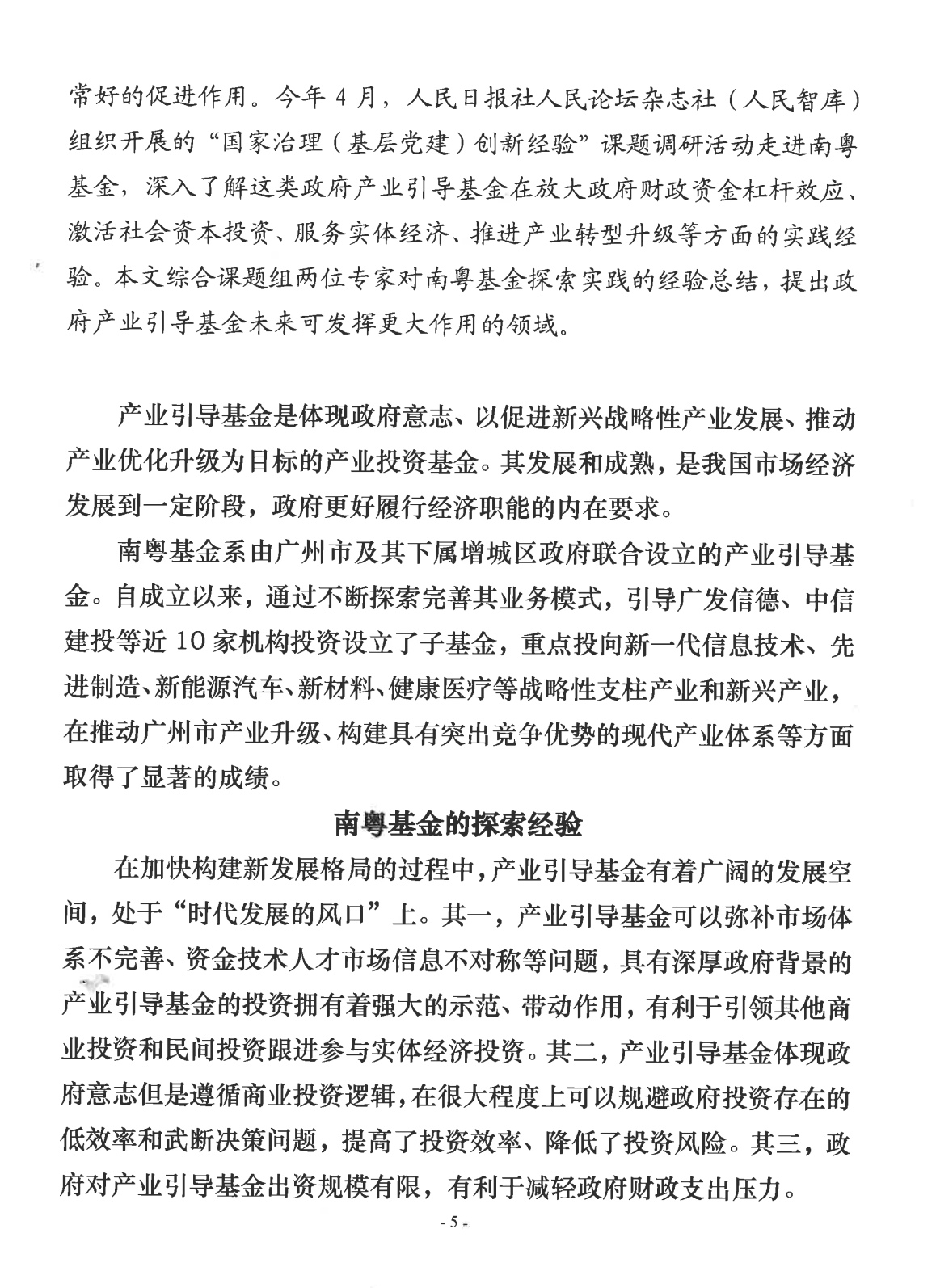 編者按:金融的根本任務(wù)在于服務(wù)實(shí)體經(jīng)濟(jì),助力科技進(jìn)步、經(jīng)濟(jì)發(fā)展,滿足人民群眾日益增長(zhǎng)的美好生活需要。在2014年11月成立的廣州南粵基金集團(tuán)有限公司(簡(jiǎn)稱“南粵基金”)是華南地區(qū)政府產(chǎn)業(yè)引導(dǎo)基金的先行者,成立之初就將助力“實(shí)體經(jīng)濟(jì)”發(fā)展這一基因作為自身的使命和擔(dān)當(dāng),短短數(shù)年時(shí)間就對(duì)廣州市的經(jīng)濟(jì)社會(huì)發(fā)展起到了非常好的促進(jìn)作用。今年4月,人民日?qǐng)?bào)社人民論壇雜志社(人民智庫(kù))組織開(kāi)展的“國(guó)家治理(基層黨建)創(chuàng)新經(jīng)驗(yàn)”課題調(diào)研活動(dòng)走進(jìn)南粵基金,深入了解這類政府產(chǎn)業(yè)引導(dǎo)基金在放大政府財(cái)政資金杠桿效應(yīng)、激活社會(huì)資本投資、服務(wù)實(shí)體經(jīng)濟(jì)、推進(jìn)產(chǎn)業(yè)轉(zhuǎn)型升級(jí)等方面的實(shí)踐經(jīng)驗(yàn)。本文綜合課題組兩位專家對(duì)南粵基金探索實(shí)踐的經(jīng)驗(yàn)總結(jié),提出政府產(chǎn)業(yè)引導(dǎo)基金未來(lái)可發(fā)揮更大作用的領(lǐng)域。