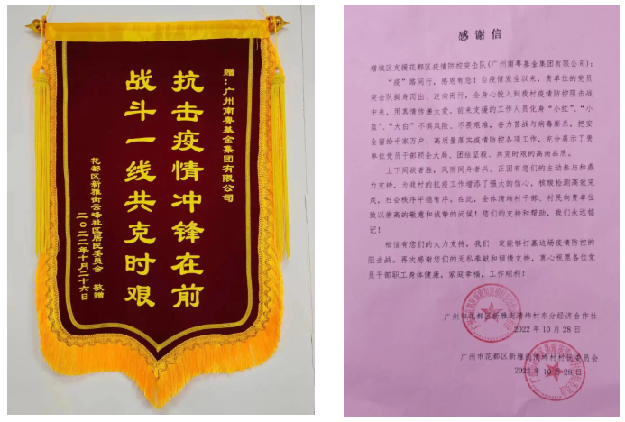 “抗擊疫情沖鋒在前,戰(zhàn)斗一線共克時艱”“疫路同行,感恩有您……”南粵基金突擊隊員們在疫情支援中的勇?lián)敗⑸谱鳛?,受到社區(qū)工作人員和居民群眾的好評,社區(qū)相繼送來感謝信和錦旗。
