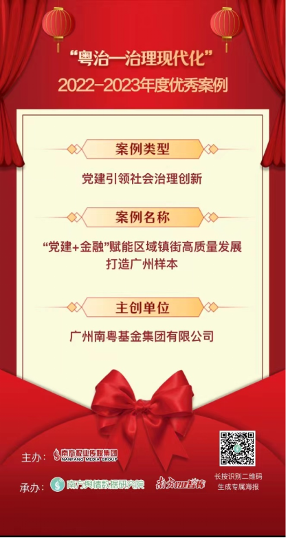 頒獎(jiǎng)推介詞這樣評價(jià)南粵基金黨建創(chuàng)新案例:“國企黨建如何助推區(qū)域高質(zhì)量發(fā)展,助力‘百千萬工程’在基層落深落細(xì)落實(shí)?南粵基金通過建立黨員先鋒隊(duì)、制定黨建共建協(xié)議等方式摸準(zhǔn)鎮(zhèn)街的金融發(fā)展需求,提供區(qū)域個(gè)性化金融服務(wù)?!h建+金融’,成功做實(shí)‘金融服務(wù)進(jìn)鎮(zhèn)街’,既為更好承擔(dān)、落實(shí)國企的政治責(zé)任、社會(huì)責(zé)任探索了獨(dú)具金融企業(yè)特色的國企黨建路子,又找到了賦能區(qū)域鎮(zhèn)街經(jīng)濟(jì)發(fā)展的好辦法?!?