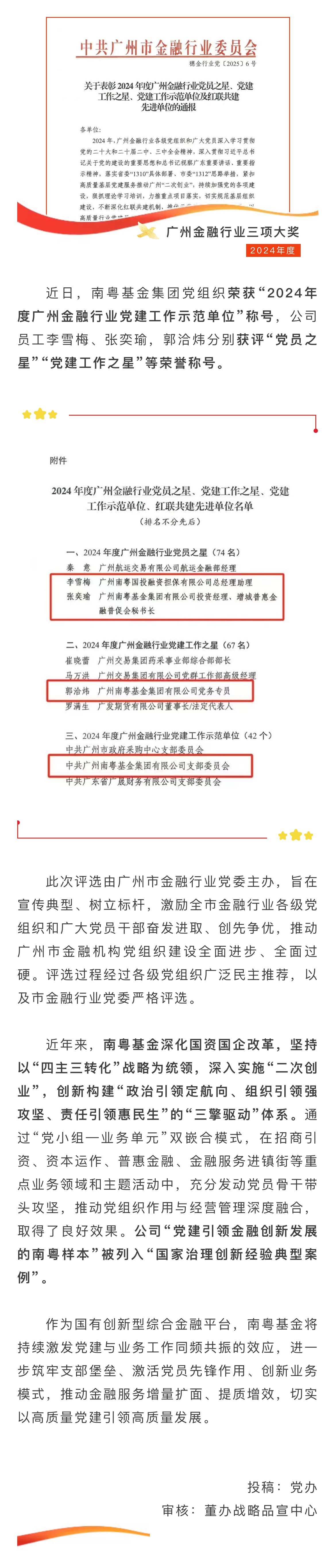 黨業(yè)融合結(jié)碩果!南粵基金獲評(píng)“廣州金融行業(yè)黨建工作示范單位”